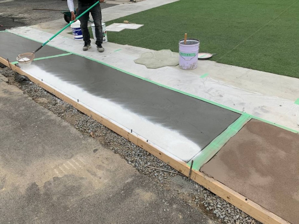 1.コンクリート打設が終えた後ベースとなる色の粉末を表面に散布しコテでならします。