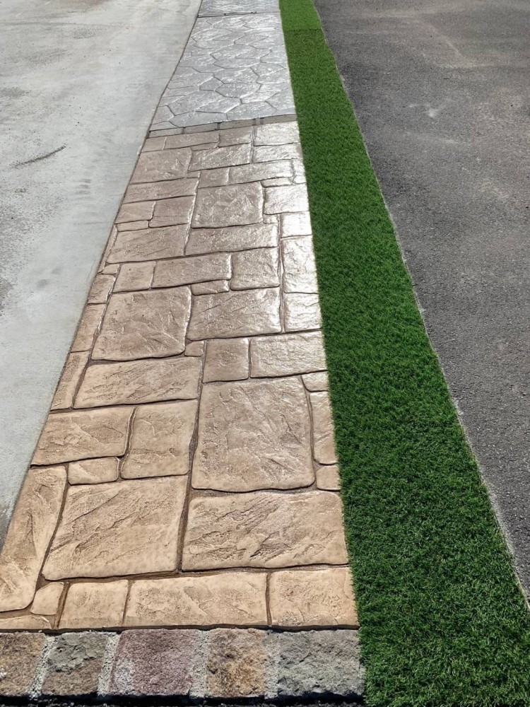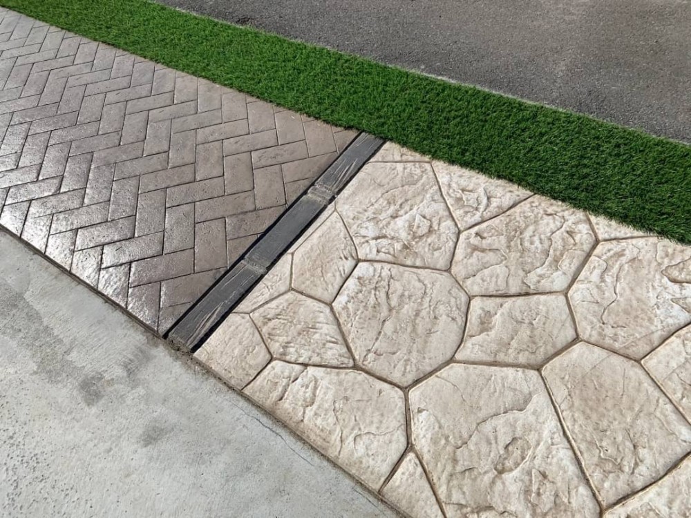 5パターンのスタンプコンクリートを敷設しましたが、どの模様も人工芝との相性は抜群に良いのではないかと思います!