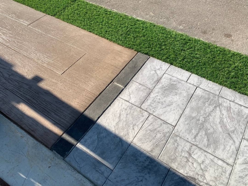 今回、スタンプコンクリートのサンプル模様を見て頂くだけでなく見切りで敷いたレンガや石などとの組み合わせ、人工芝との相性などを見て頂こうと思い人工芝も敷設しました。