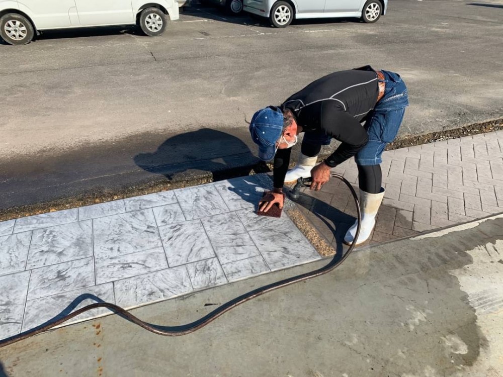 本日はコンクリートが完全に固まったので水洗いをして、表面の保護と光沢を出す為のコーティングです。